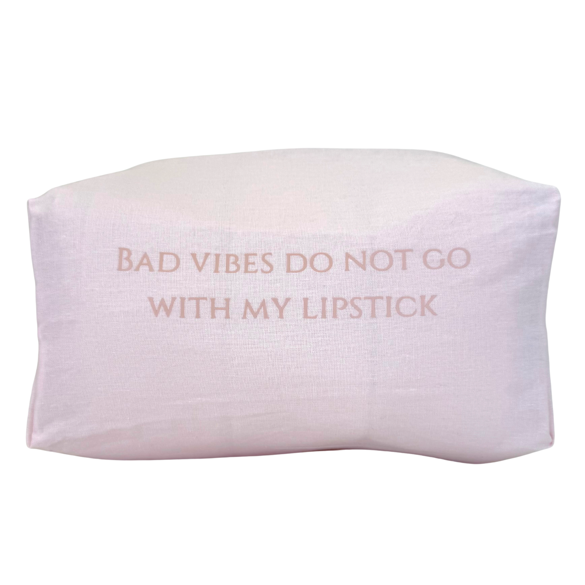 This Beauty Bag is made from Cotton Fabric. Inside you find the Quote "Bad Vibes do not go with my Lipstick".
